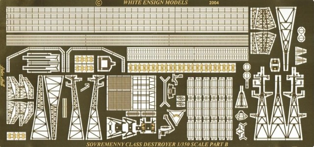 Fret 2 contains: 3 bar railings, vertical ladders, helicopter restraint net retainer frame, folded helicopter rotors, small access doors, mainmast port yard aft frame, mainmast stbd yard aft frame, mainmast port and starboard yards, mainmast port and starboard yard lower frame, small access doors, 956 mainmast: forward and aft lattices, port and starboard lattices, top antenna, forward and aft platforms; hangar deck extension rails, fregat radar: small and large front plates, small and large rear frames, IFF mounting plate, small and large mountings and centre pintle; "top steer": radar rear and front dipole, stays and plate, IFF mounting, centre pintle bracket; rear screen mounting frame, funnel platform supports, solid railing rounded end sections, standard QR doors, walkway railing, DF loop antenna (free standing), foremast platform aft walkway, foremast platform stbd sensor support, helicopter rotor head plates, 956E mainmast lattices, 956E mainmast side platforms, 956E mainmast yard stbd aft frame, 956E mainmast yard port aft frame, 956E mainmast yard stbd, 956E mainmast yard port, 956E mainmast aft lattice, mainmast DF loop antenna, UHF type antenna, fregat radar IFF antenna.